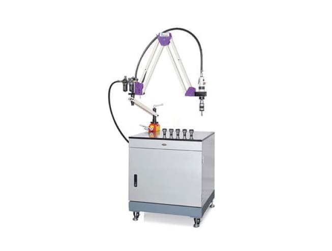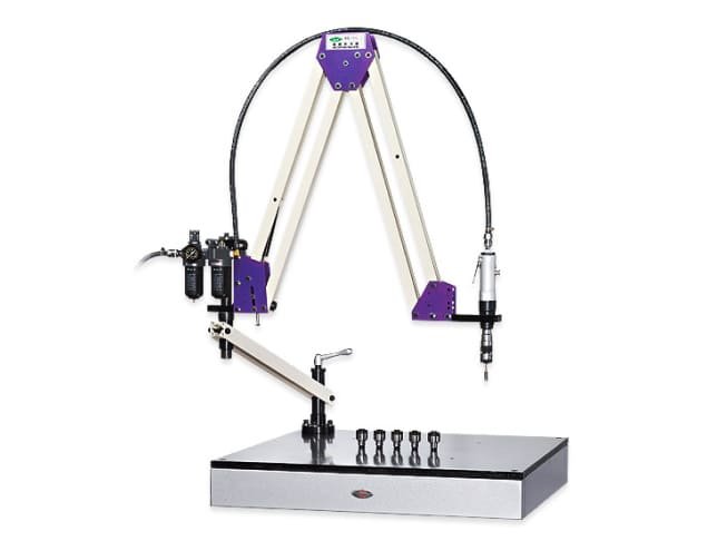 Dengan arm paralel, kolom mounting meja dan unit udara terpadu, mesin ini menghadirkan fleksibilitas tinggi dalam penempatan dan arah tap. Standar dilengkapi adaptor kopling keselamatan dan jib radial untuk kemudahan akses. Cocok untuk pekerjaan lubang ulir pada logam, komponen besar, dan produksi massal.