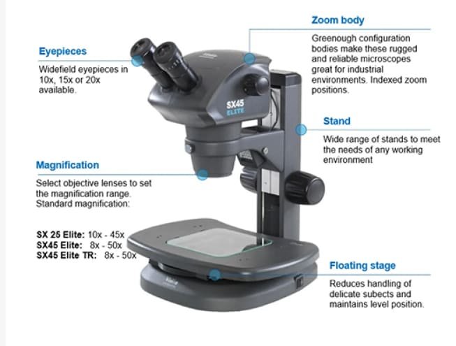 Dengan jarak kerja ekstra panjang 115 mm, SX45-TR memungkinkan pengamatan detail sekaligus manipulasi objek mikro dengan mudah. Fitur click-stop mempercepat pemilihan perbesaran, sementara kepala trinokuler memberikan fleksibilitas penggunaan kamera digital untuk dokumentasi dan analisis visual berkualitas tinggi.